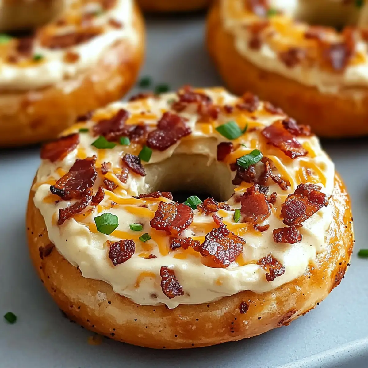 After baking, remove the tray from the oven and let the bagels cool for a couple of minutes. For an extra touch, sprinkle reserved crispy bacon bits and fresh chives on top of each bagel. These little garnishes not only add flavor but also a pop of color to your delicious Bacon Cream Cheese Bagels, ready to impress your family and friends!