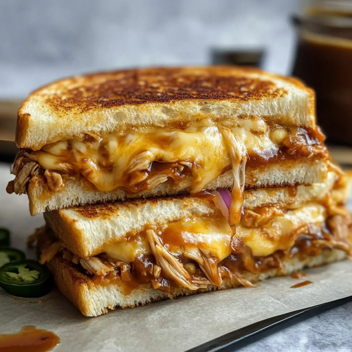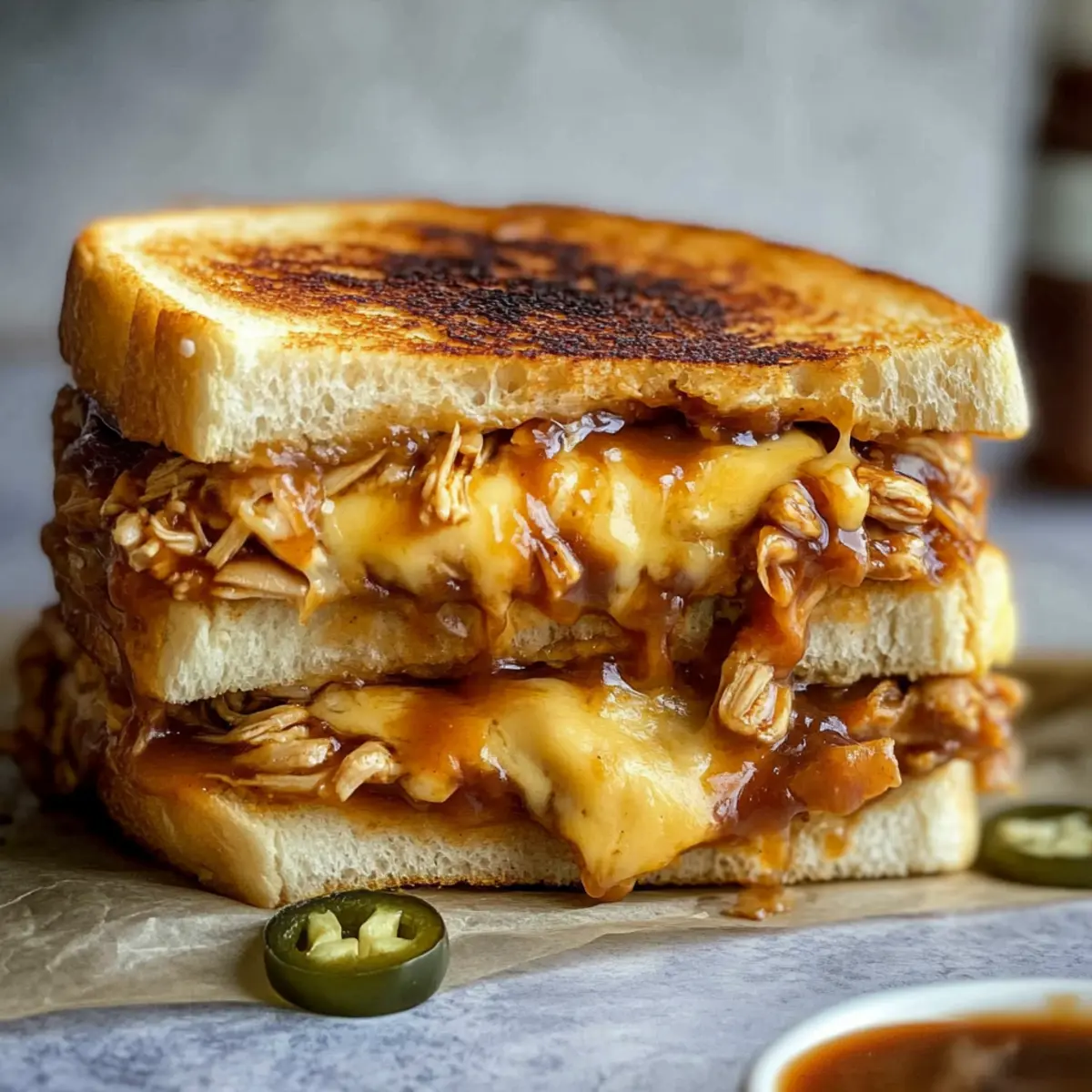 Be mindful of potential allergens! This recipe contains dairy (cheddar and Monterey Jack cheese), gluten (sourdough bread), and can be made spicy due to jalapeños, which may not sit well with everyone. Always consider your guests’ dietary restrictions when preparing this delicious BBQ Chicken Grilled Cheese.
