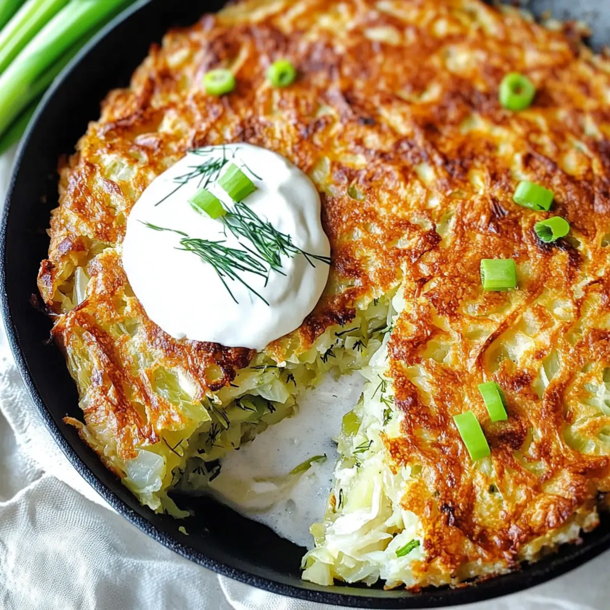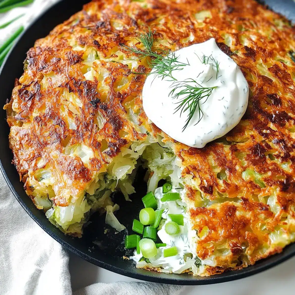 Once both sides are cooked to a delicious golden-brown, allow the Cabbage Pie to cool slightly before slicing it into wedges. Serve warm, garnished with additional chopped green onions or fresh dill. This delightful dish pairs wonderfully with the creamy dill sauce for an extra touch of flavor.