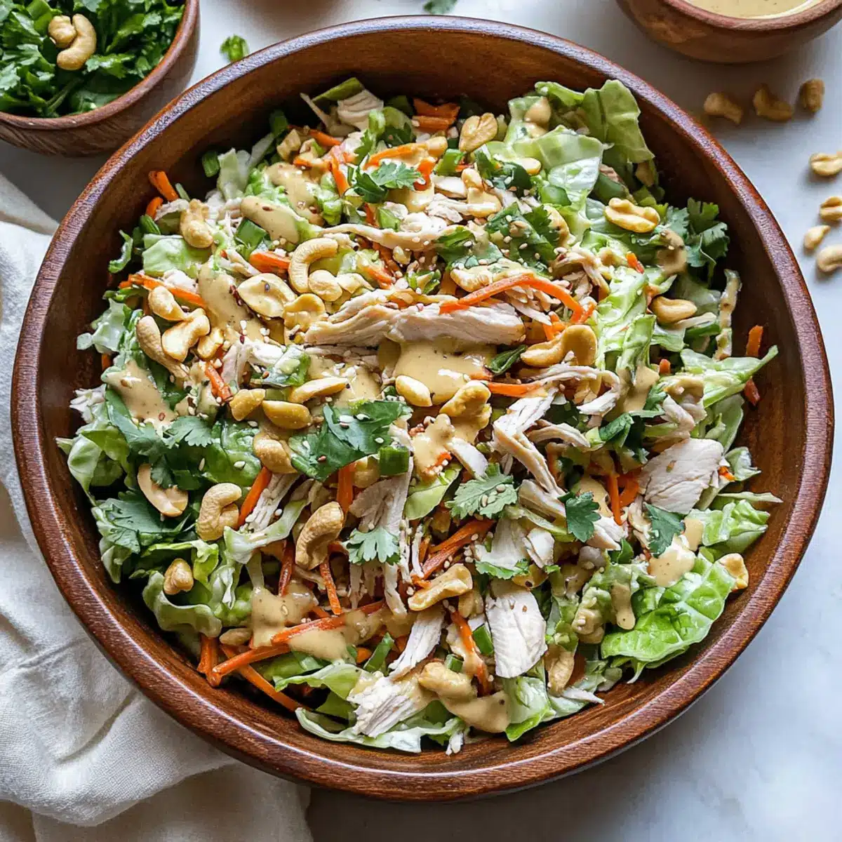 These Chicken Cashew Crunch Salad bowls are perfect for busy home cooks looking to save time during the week! You can prep the salad components—like the chopped Napa cabbage, shredded rotisserie chicken, and matchstick carrots—up to 3 days in advance by storing them separately in airtight containers in the refrigerator to keep everything fresh and crisp. For the dressing, prepare it ahead of time and it can last for up to 5 days in the refrigerator. Just be sure to whisk it well before serving. When it’s time to enjoy, simply combine the ingredients and drizzle with the dressing, and you’ll have a vibrant, delicious meal in no time!