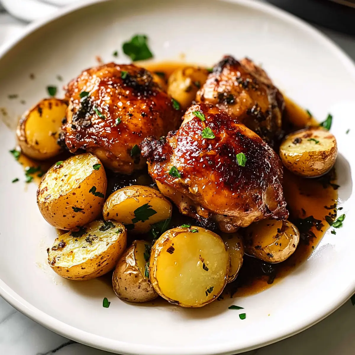 Drizzle the marinade generously over both the chicken thighs and potatoes, ensuring everything is evenly coated. Use a brush or your hands to make sure the marinade seeps into the chicken skin and potatoes. Keep the potatoes arranged around the chicken to maintain their crispiness during baking.