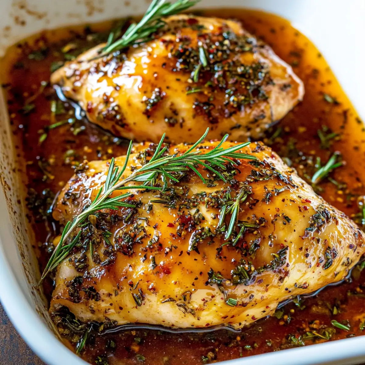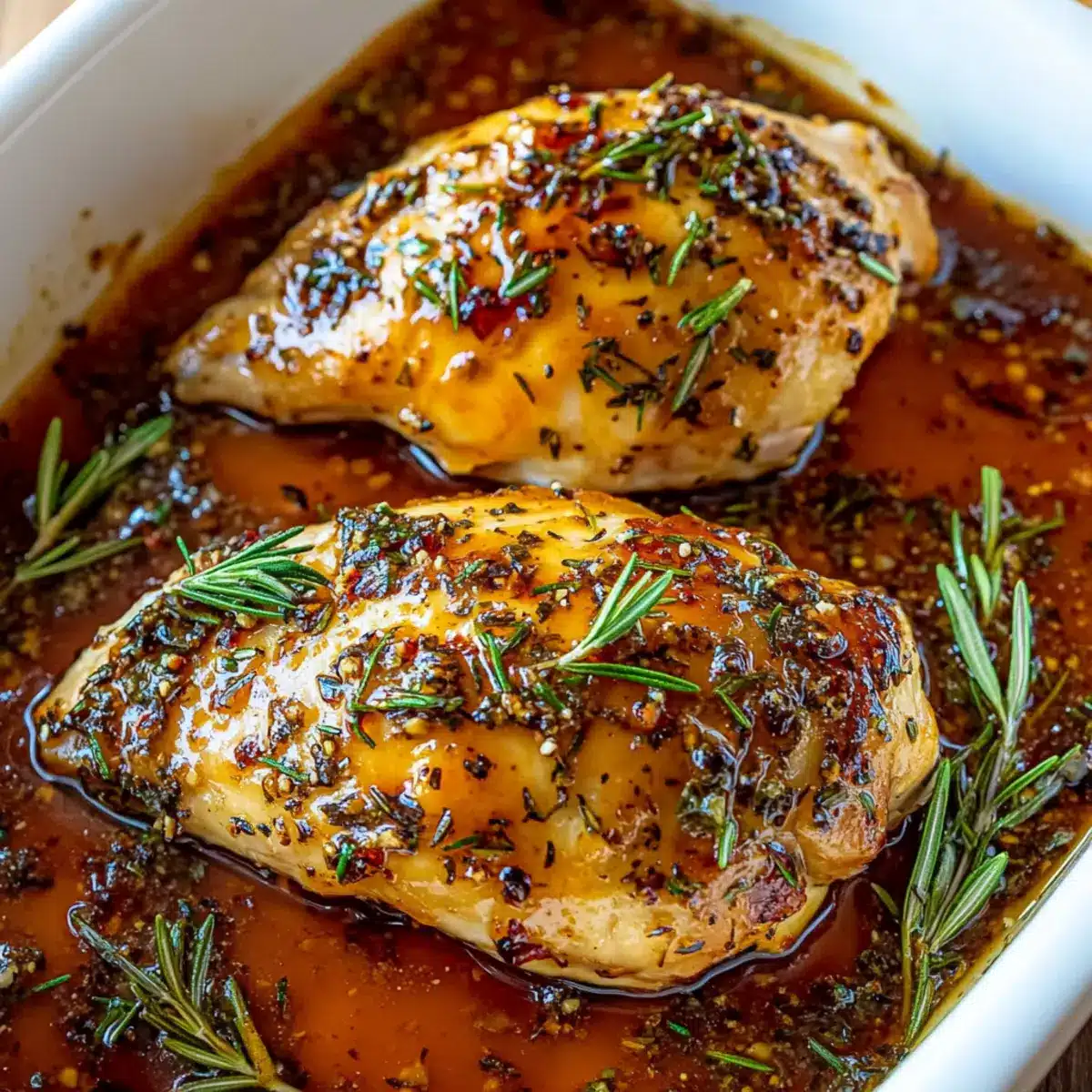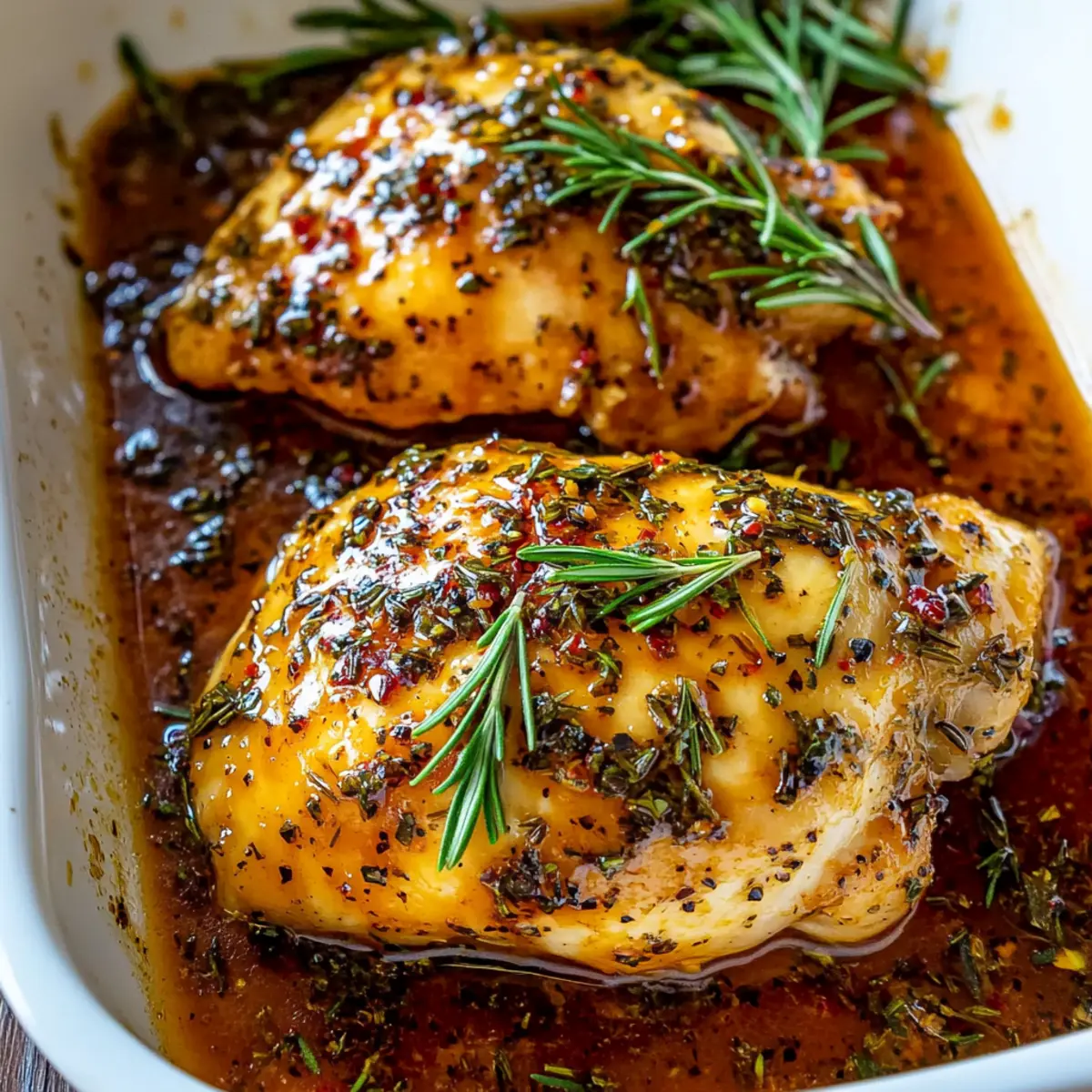 - Place the boneless skinless chicken breasts or thighs in a large mixing bowl. Pour the prepared sauce over the chicken, ensuring each piece is generously coated. Transfer the marinated chicken to a baking dish, arranging them in a single layer. Tuck fresh rosemary sprigs among the chicken.