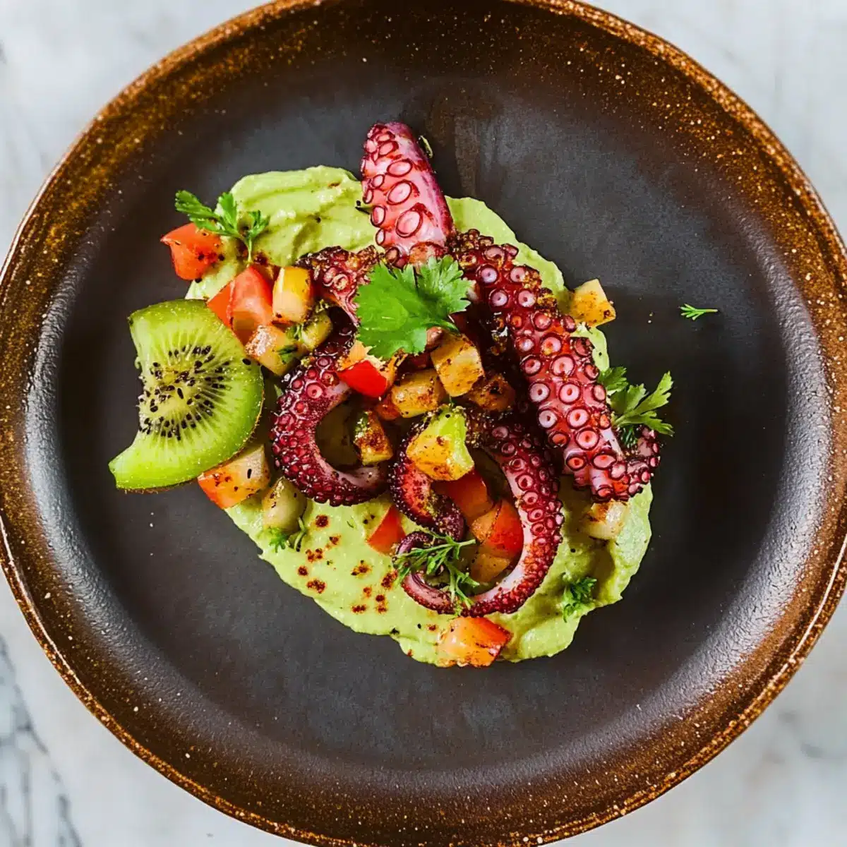 - Assemble the Salad: Spread avocado cream on each plate, top with picada, then crispy octopus. Garnish with kiwi slices, coriander cress, paprika, and olive oil.