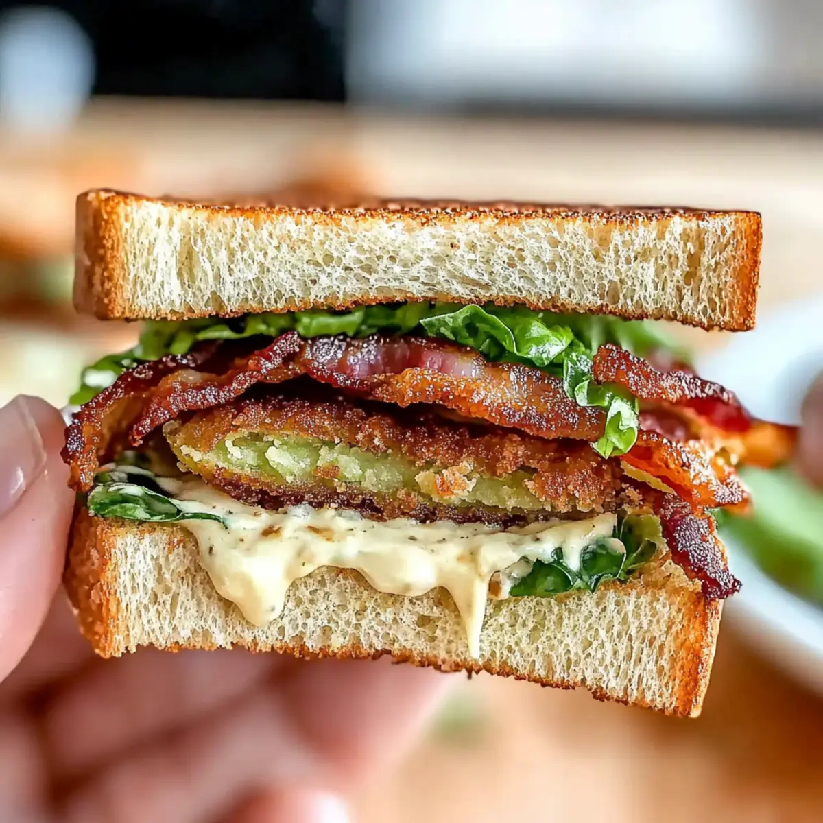 Toast slices of your chosen bread until golden brown. Start by spreading the zesty sauce onto one slice of bread, then layer on fresh lettuce, followed by the crispy fried green tomatoes. Top with the cooked bacon, finishing with another slice of bread. Serve your delightful Crunchy Fried Green Tomato BLT Sandwich warm for maximum flavor!