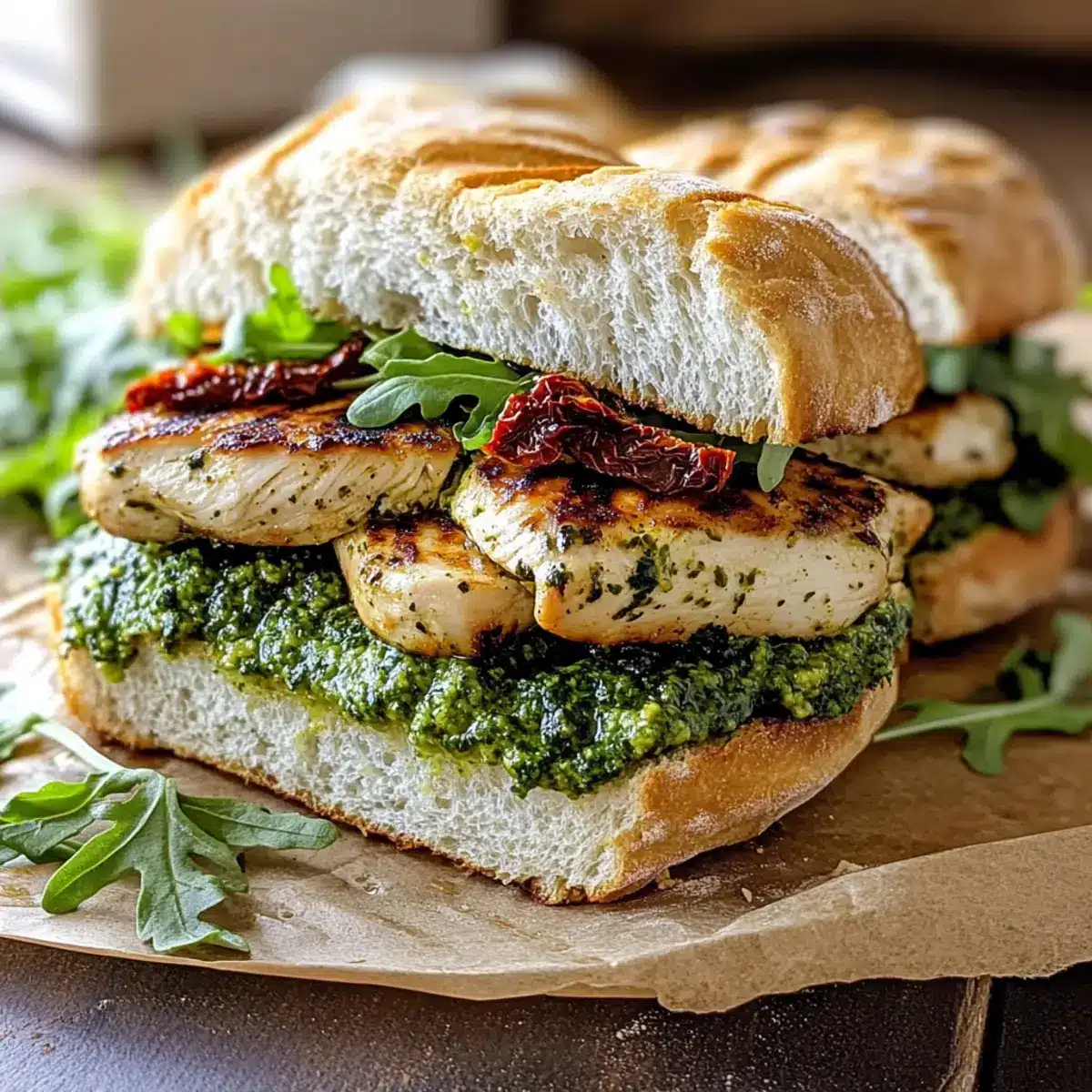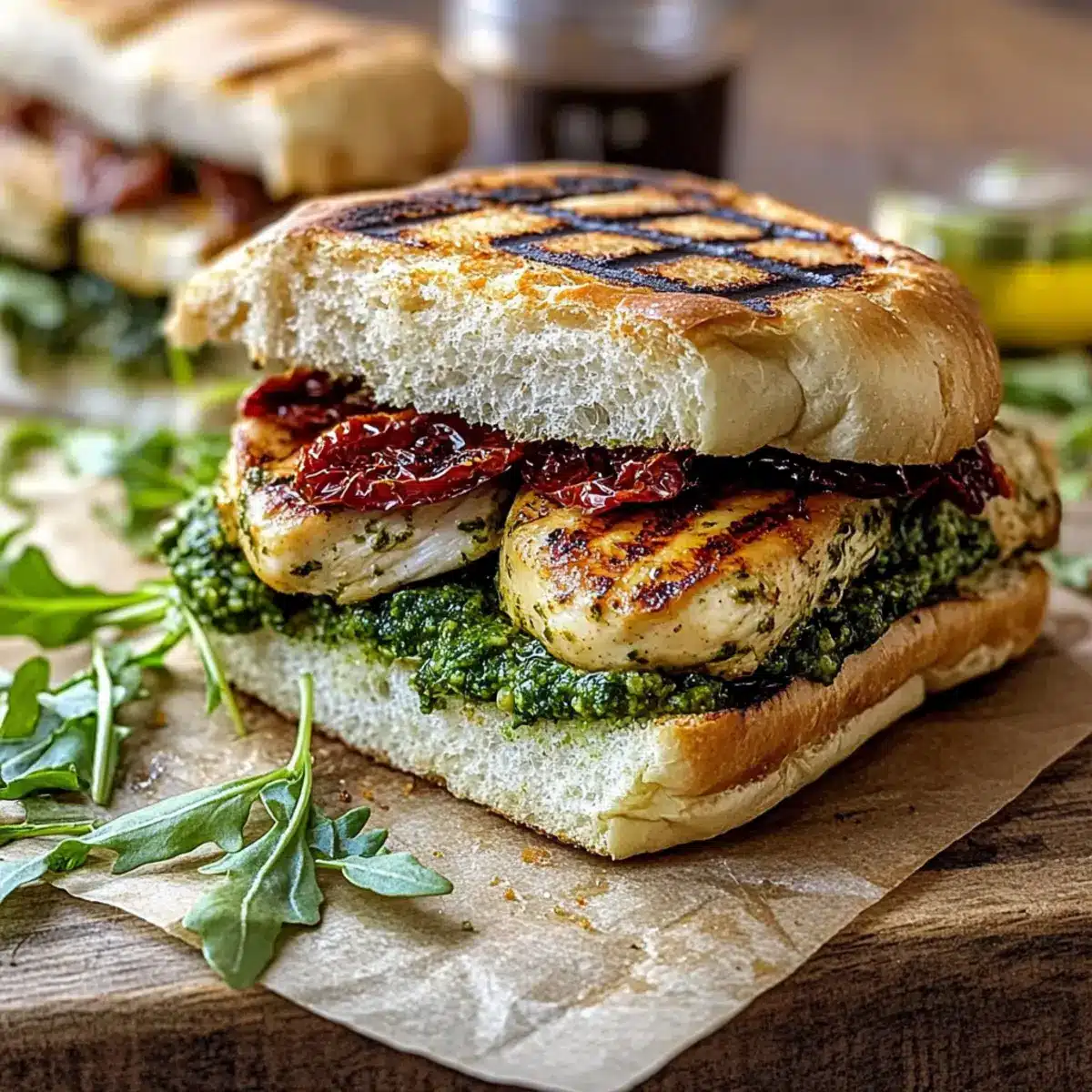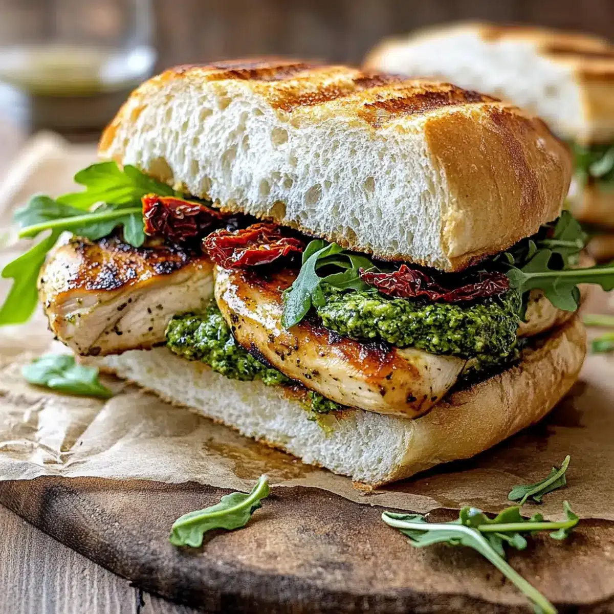 - On rustic bread, spread pesto on both sides. Layer with grilled chicken, mozzarella, sun-dried tomatoes, and arugula. Top with second slice.