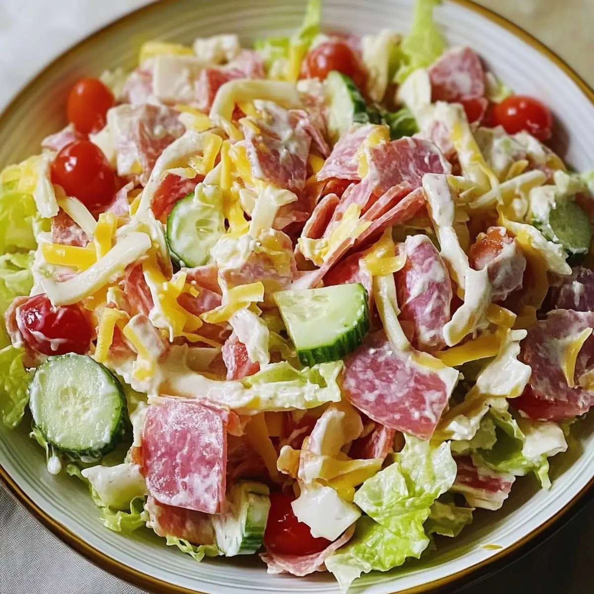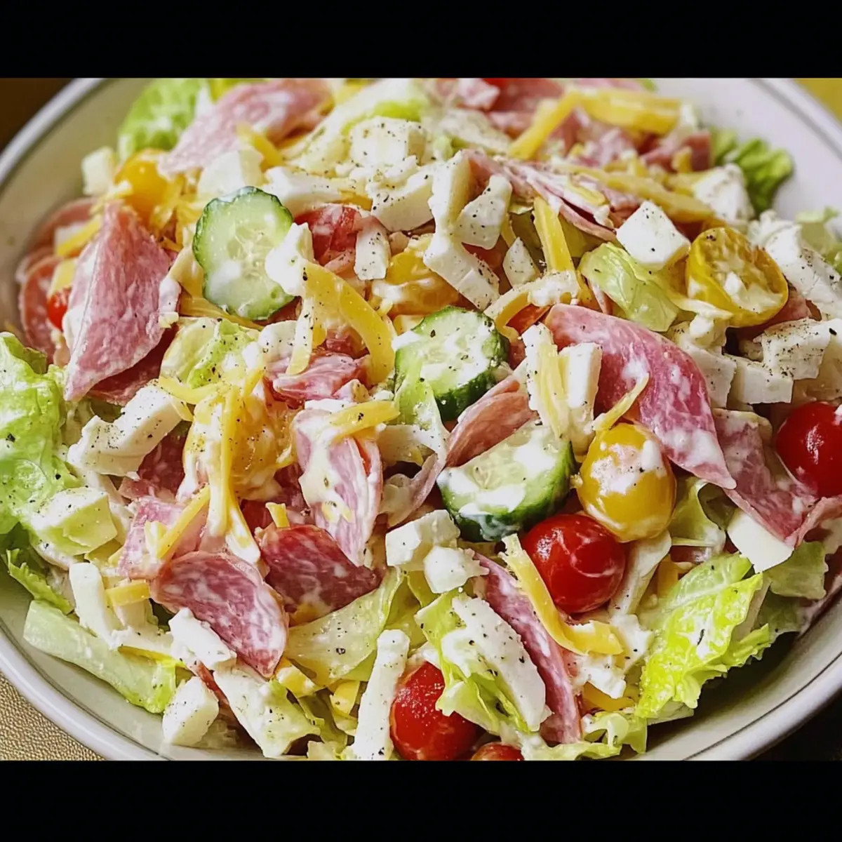 Flavor Explosion: This Grinder Salad bursts with bright flavors, combining savory meats, crunchy vegetables, and a creamy dressing that makes each bite irresistible.