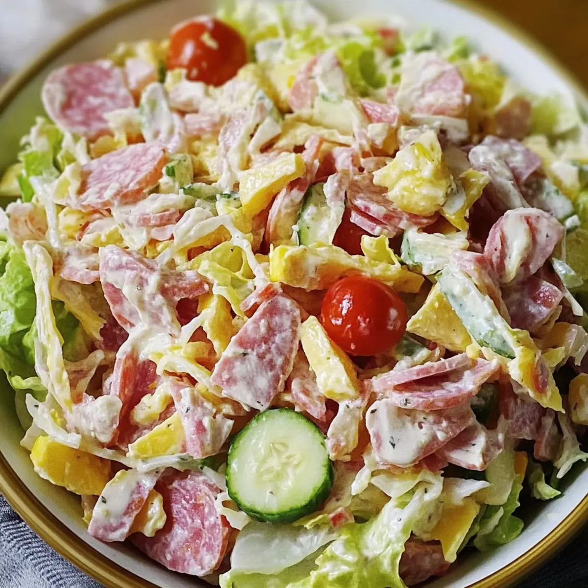 Making Ahead: If you plan to prepare the salad ahead of time, chop the veggies and meats but wait to combine them until just before serving for optimal crunch.