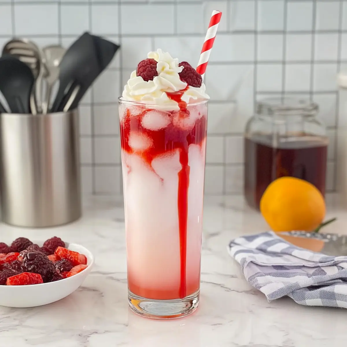 • Fruit Syrup (6-8 tablespoons) – Sweetens and flavors your soda; opt for store-bought or homemade syrups like raspberry or peach for an authentic touch.