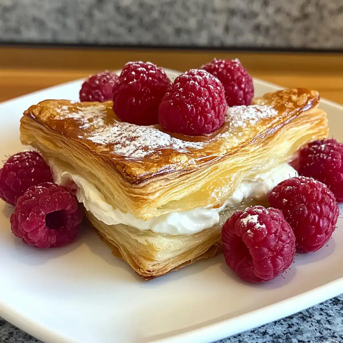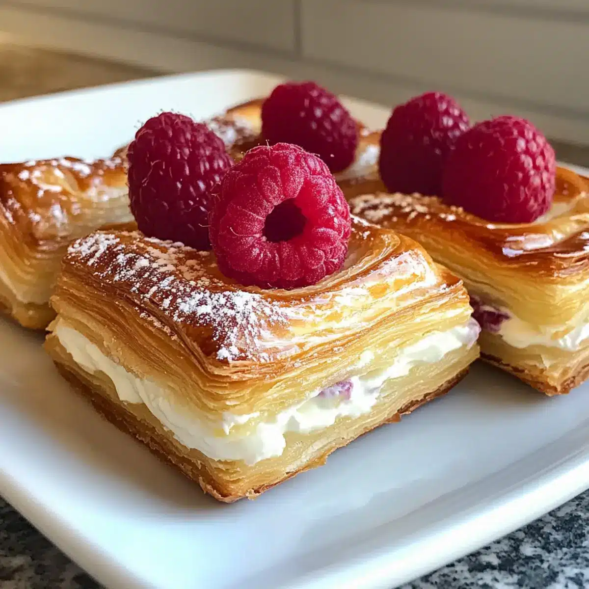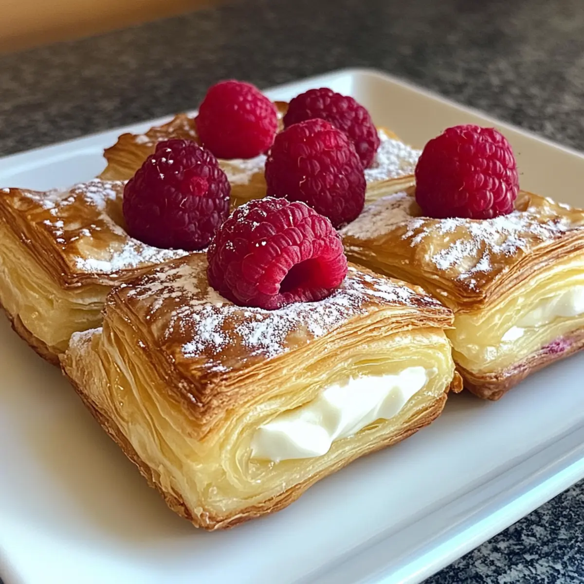 - Place a tablespoon of the cream cheese filling in the center of each pastry square and top with fresh raspberries.