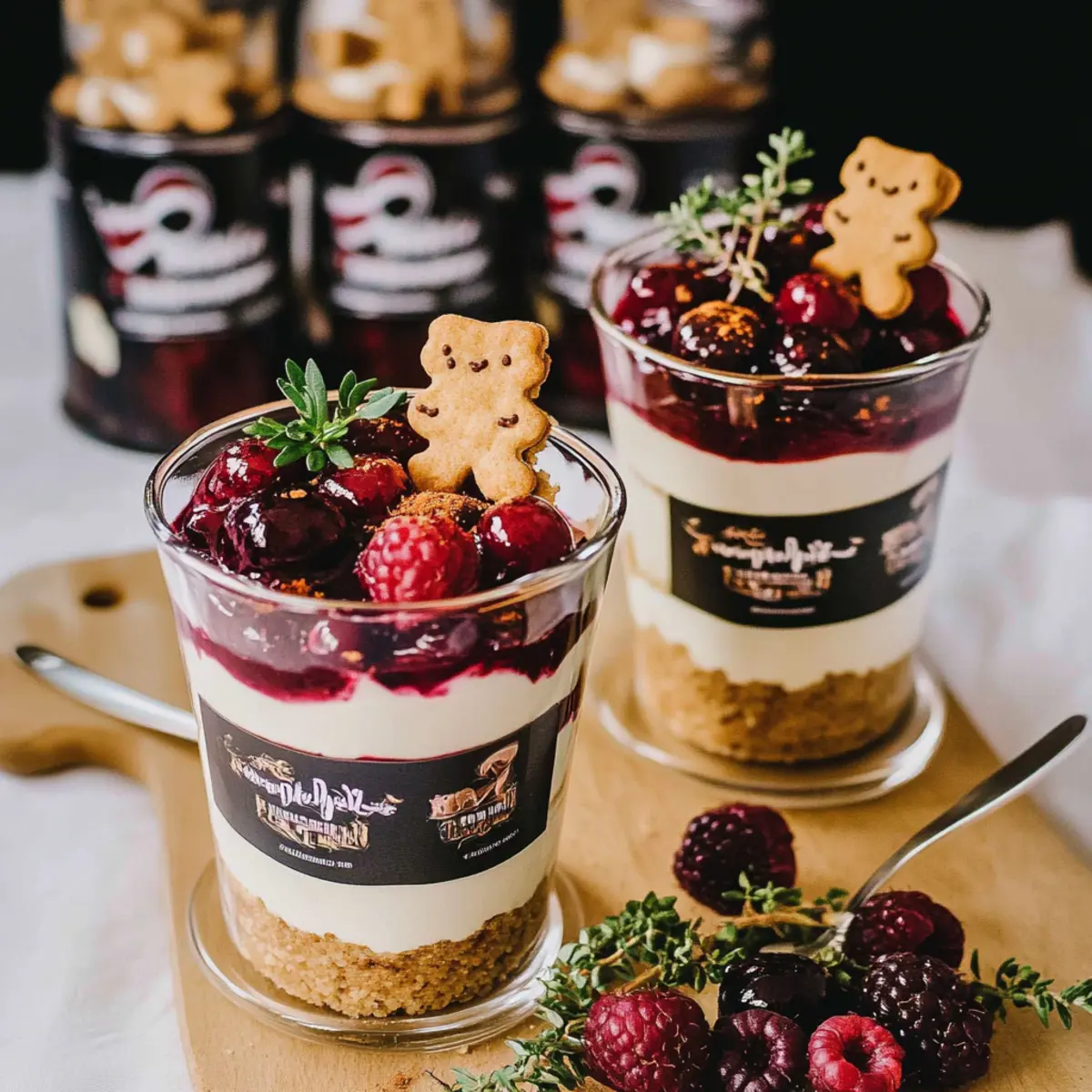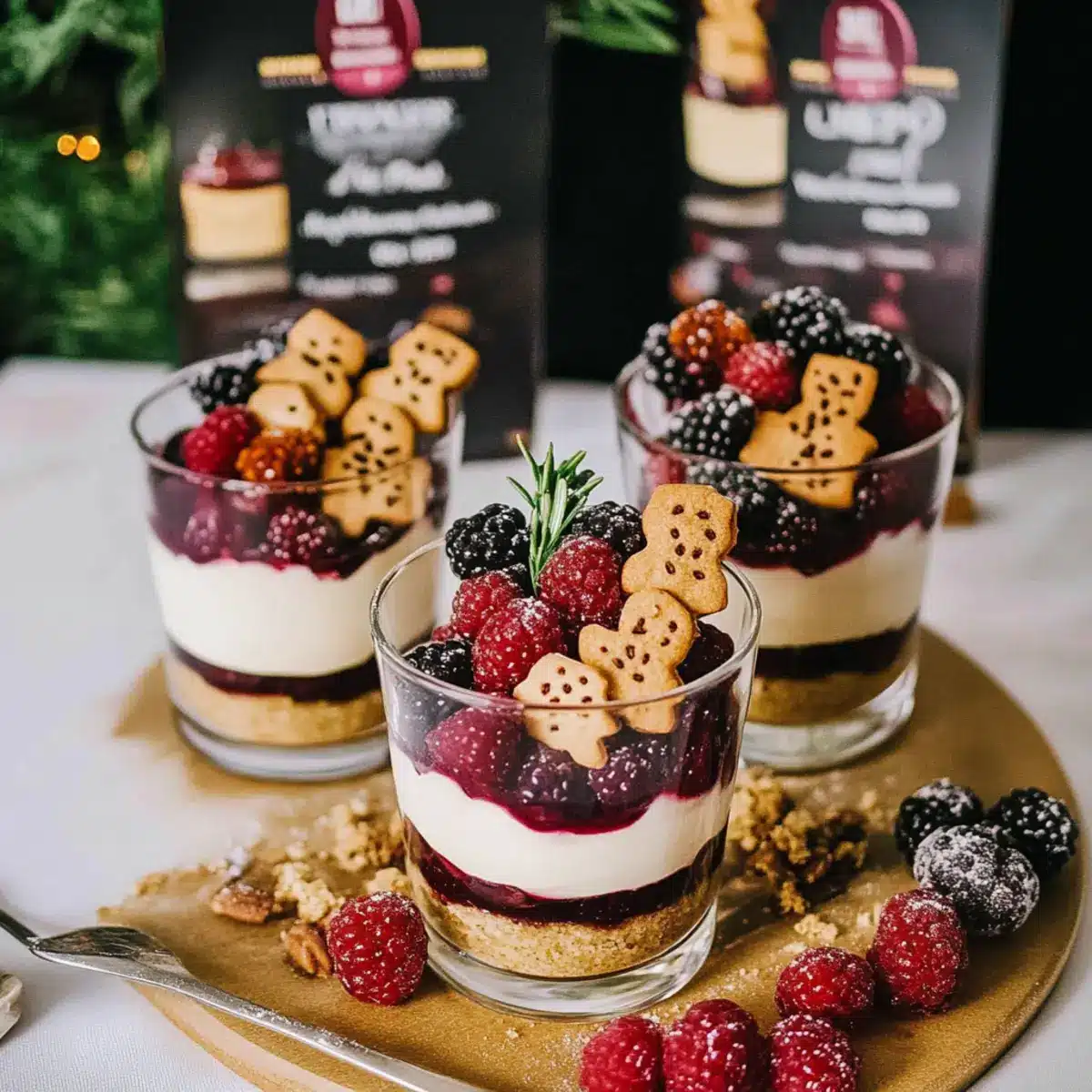 Once chilled, remove the cheesecakes from the refrigerator. Top each cheesecake with the cooled mulled wine fruit to add a burst of flavor and color. For an extra festive touch, garnish with a gingerbread man, optional sugared cranberries, and a sprig of thyme or rosemary. Your stunning no-bake white chocolate cheesecakes are now ready to delight your guests!