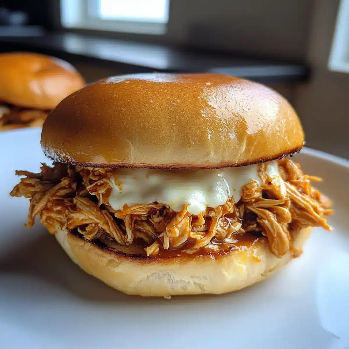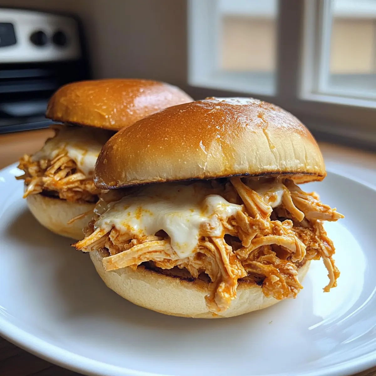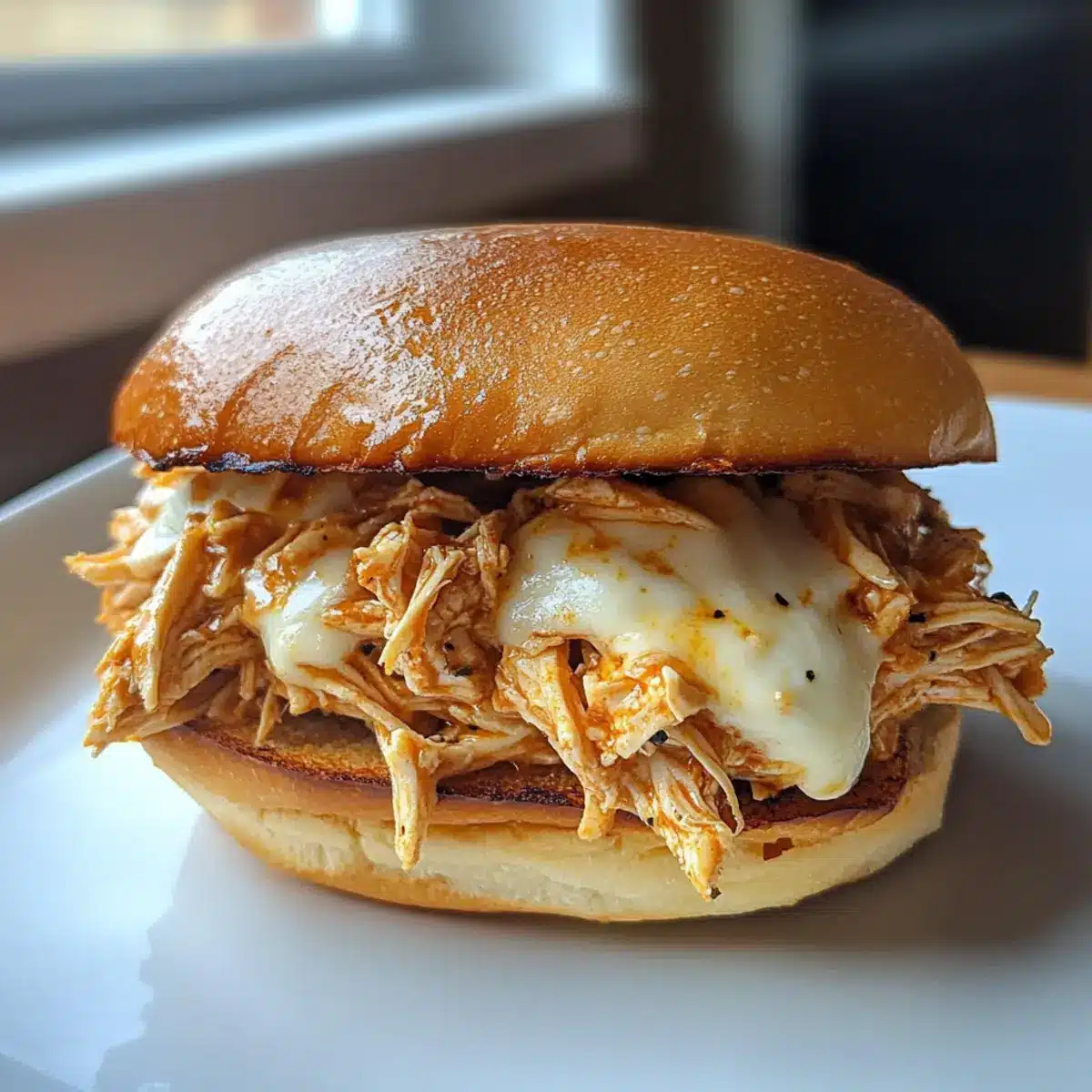 - Load the toasted rolls with the shredded chicken, top with mozzarella cheese, and optionally broil for 1-2 minutes.
