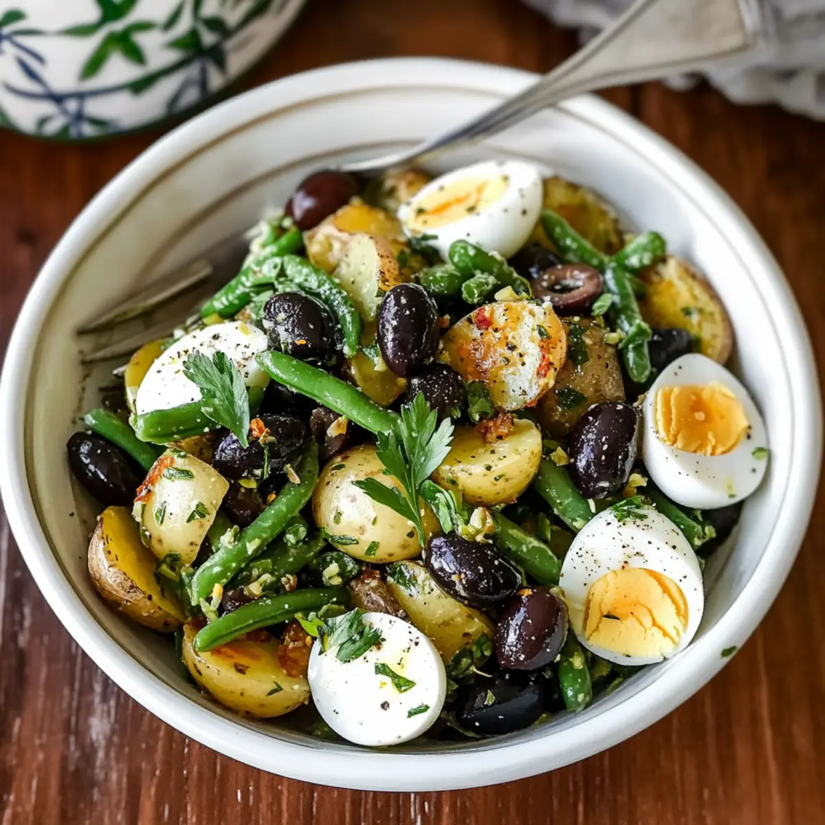 Vibrant Flavors: This salad is a celebration of Mediterranean tastes, bringing together tender new potatoes, crisp green beans, and a tangy vinaigrette for a refreshing bite.