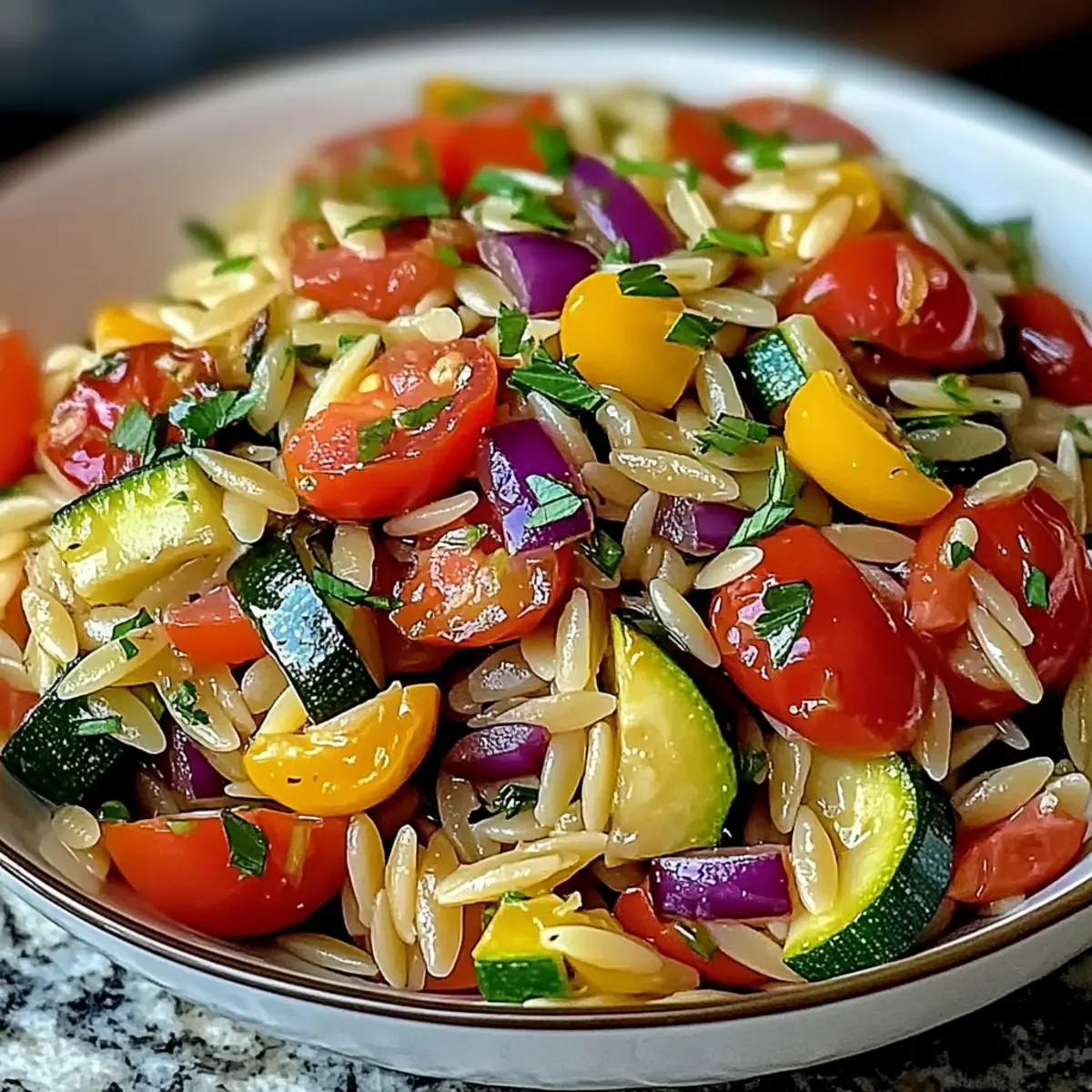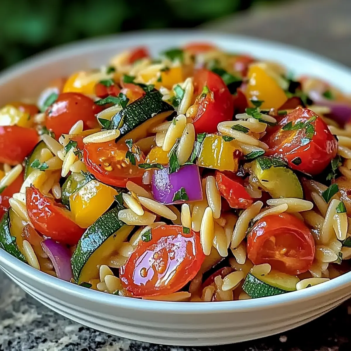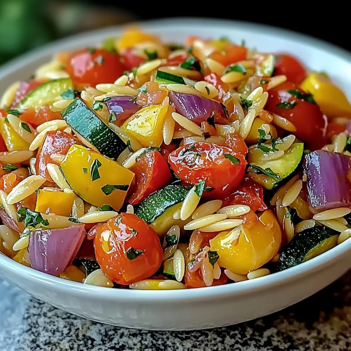 Vibrant Colors: This dish is a feast for the eyes, featuring a rainbow of roasted vegetables mingled with tender orzo.