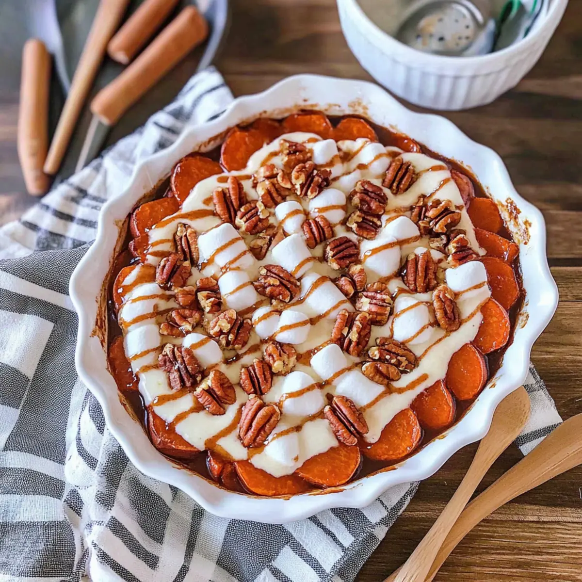 - After baking, remove foil, drizzle remaining sauce, and top with pecans and marshmallows.