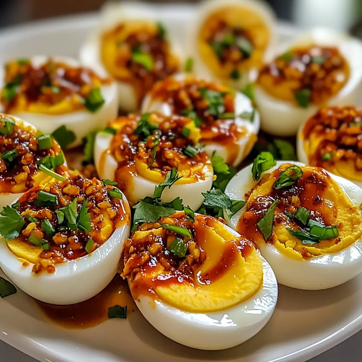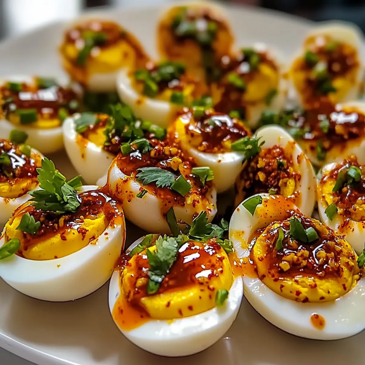 First Impressions: Garnish beautifully with sriracha or fresh herbs to impress your guests—the visual appeal complements the intense flavors of your deviled eggs!