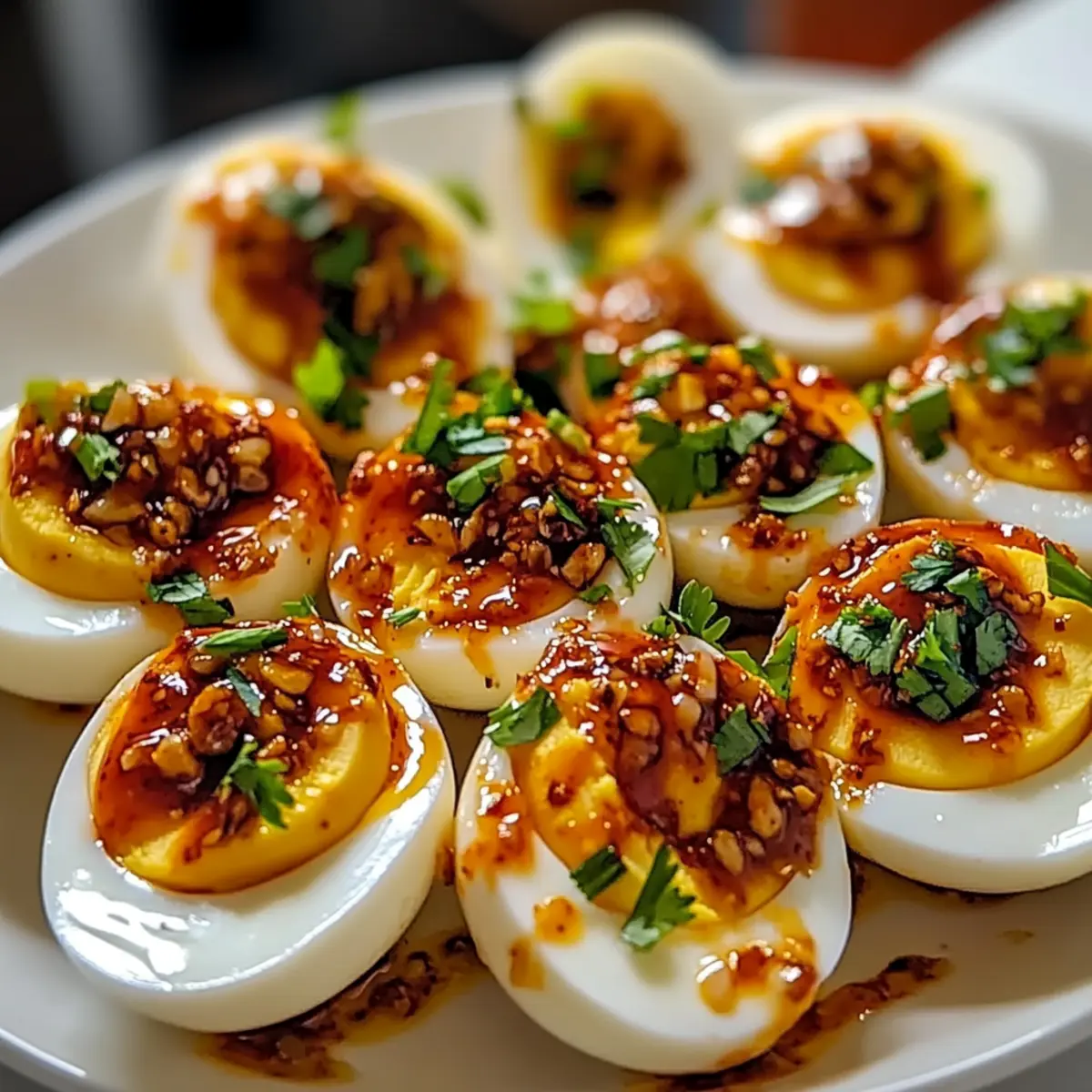 Enhance the presentation of your Spicy Chili Garlic Deviled Eggs by garnishing them with a drizzle of sriracha, a sprinkle of freshly chopped cilantro, or sliced green onions. Serve these colorful deviled eggs immediately on a decorative platter or individual cups, allowing everyone to relish in their fiery goodness!