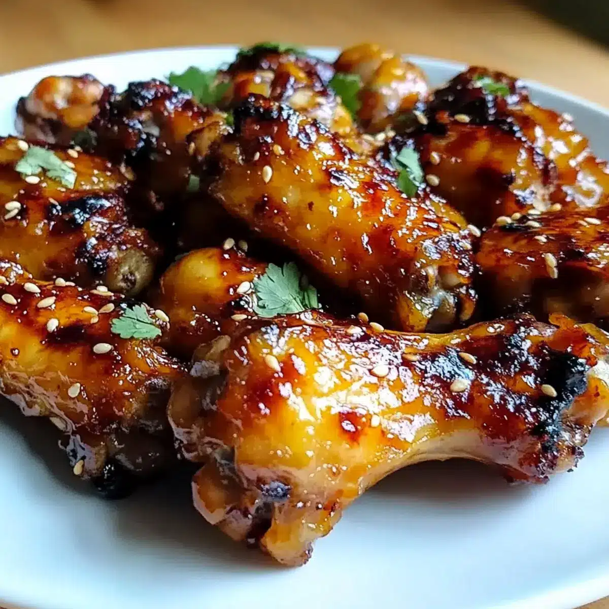 - Serve the wings on a plate, optionally drizzling reserved sauce and garnishing with sesame seeds and cilantro.