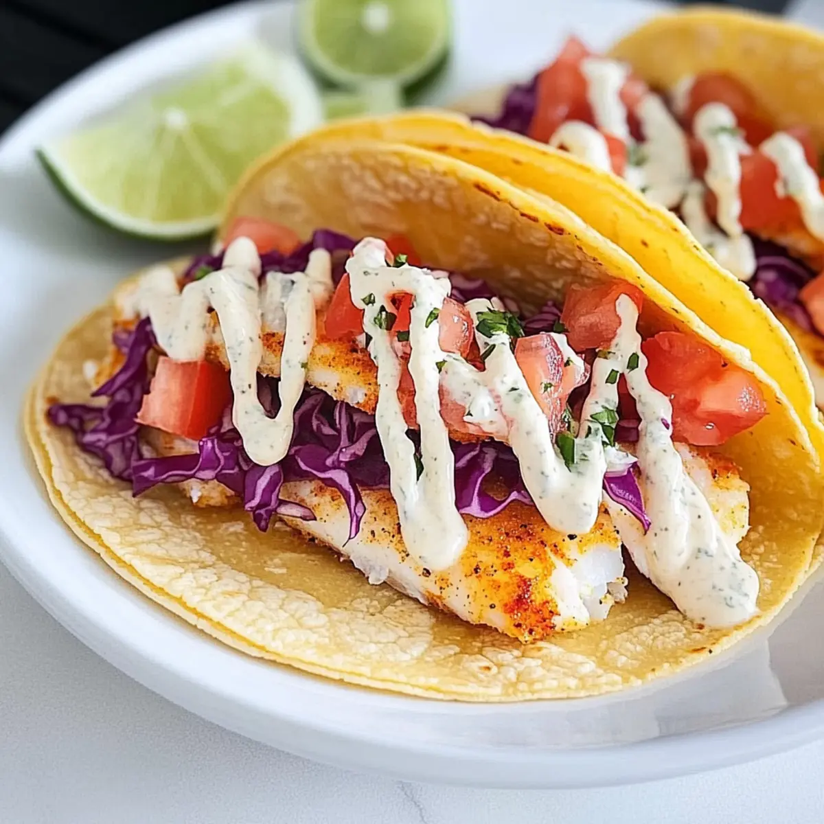Once the fish has finished baking, remove it from the oven and let it cool slightly before breaking it into smaller pieces. Take two corn tortillas, stack them, and add a portion of the flaky tilapia. Top with crunchy red cabbage, diced tomato, and crumbled cotija cheese, then drizzle generously with your zesty sauce and a squeeze of fresh lime juice.